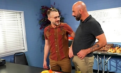 Two bearded fellwos do some hard-core anal fisting on the desk